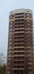 Сложность фасада состояла в том, что работы проводились на высоте 16 этажа МКД. Облицовка металлокассетами с помощью альпинистов